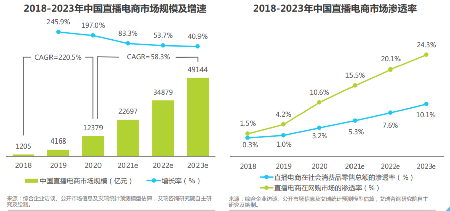 那么唯一能扭转亏损现状的,就只有电商了,宇宙的尽头,还是带货。 即便内容社区转电商还没有成功的先例,但这也是没有选择的选择,而直播电商的火热,在推高电商天花板的同时,也进一步提升了流量转化的效率。根据艾瑞咨询《2021年中国直播电商行业研究报告》,2020年中国直播电商市场规模超1.2万亿元,预计2023年超过4.9万亿元。